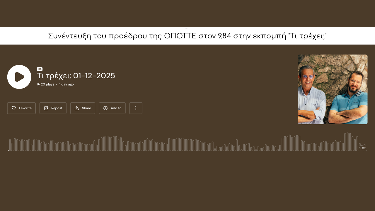 1 Δεκεμβρίου 2025 ΝΕΑ Συνέντευξη του προέδρου της ΟΠΟΤΤΕ στον 9.84 στην εκπομπή Τι τρέχει; 01-12-2025 Share: